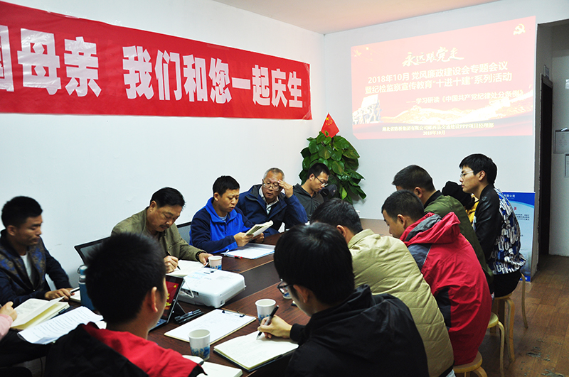 10月19日,为坚持全面从严治党,杜绝贪腐现象的滋生,湖北路桥郧西PPP项目积极响应集团公司党委的廉政号召,组织开展了2018年10月党风廉政建设专题会议暨纪检监察宣传教育“十进十建”系列活动。