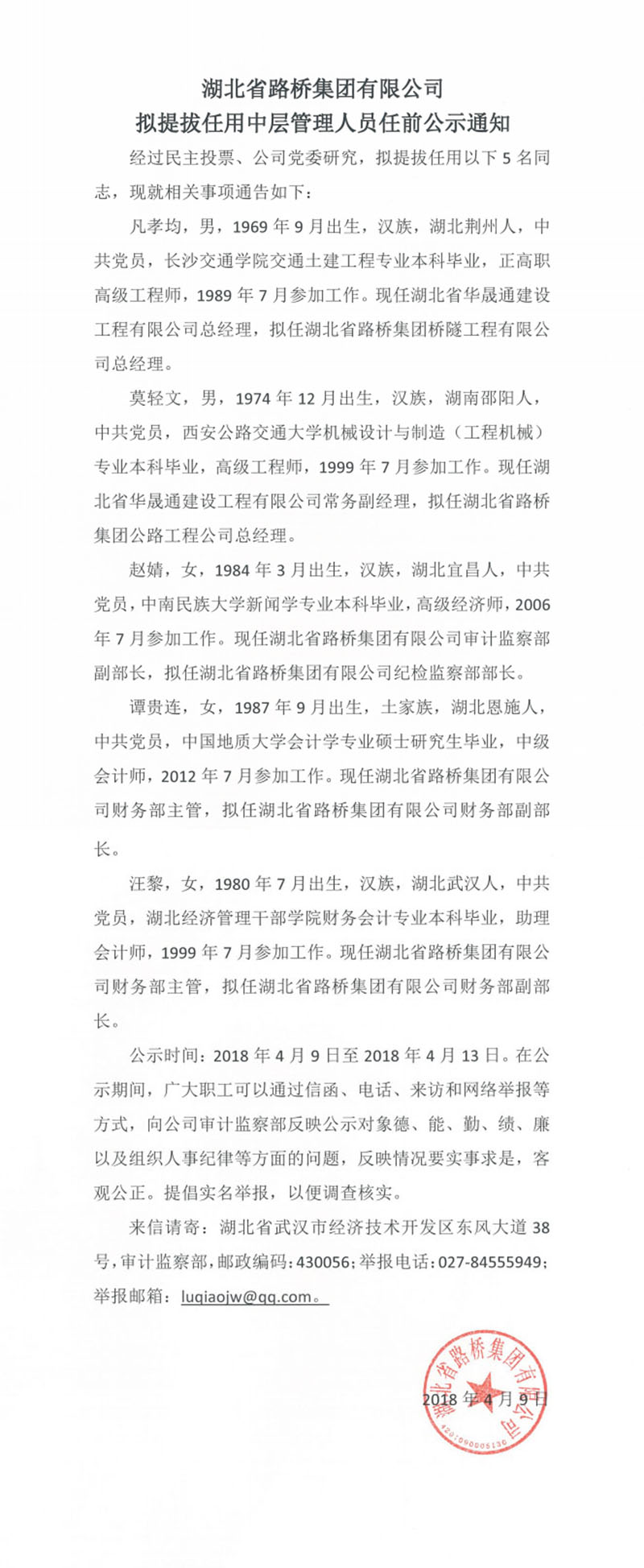 华体会平台拟提拔任用中层管理人员任前公示通知