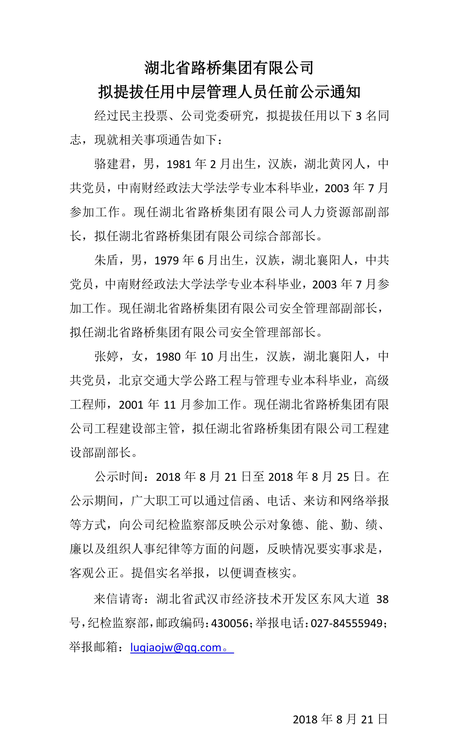 2018年华体会平台拟提拔任用中层管理人员任前公示通知