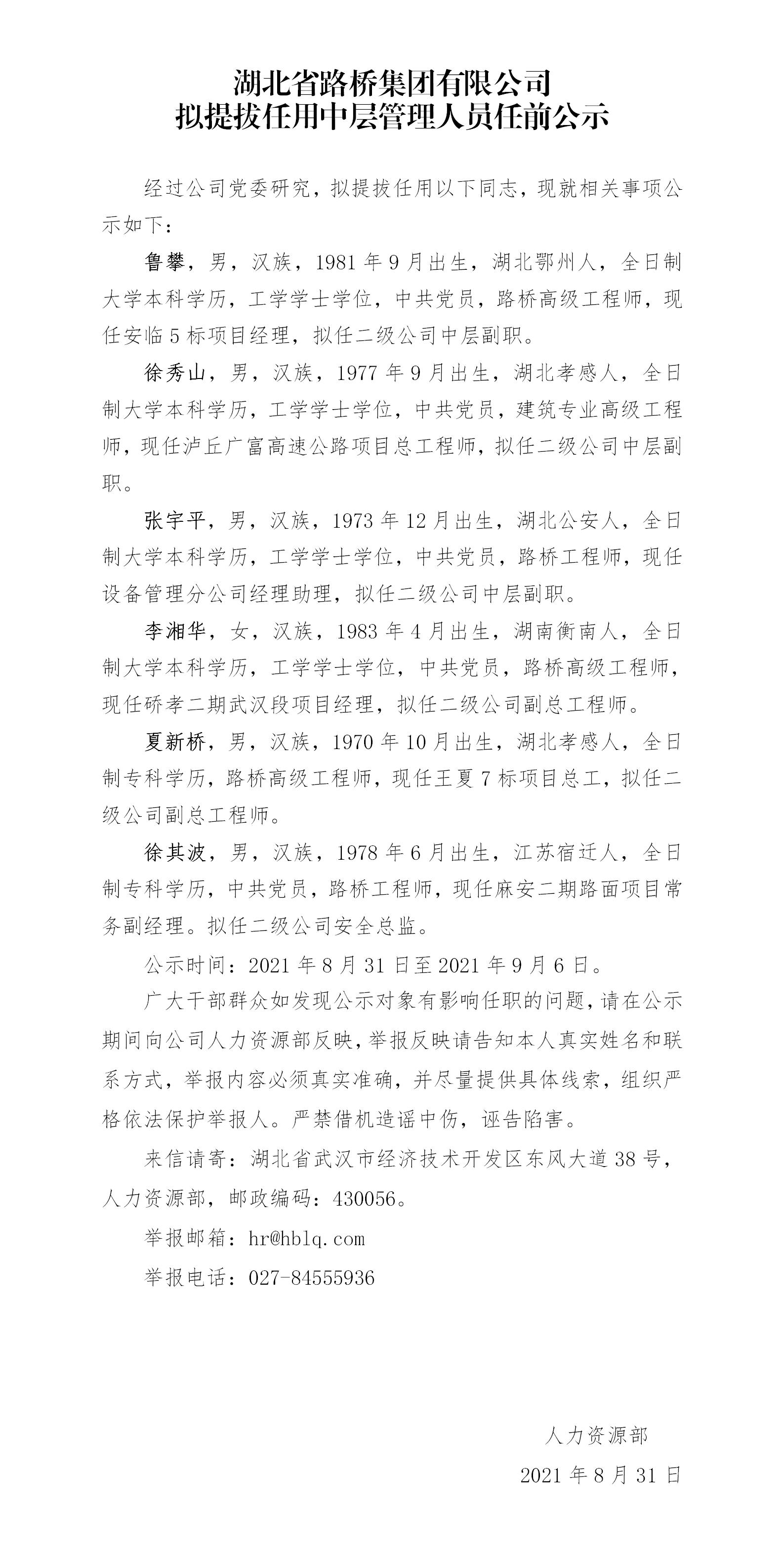 华体会平台拟提拔任用中层管理人员任前公示