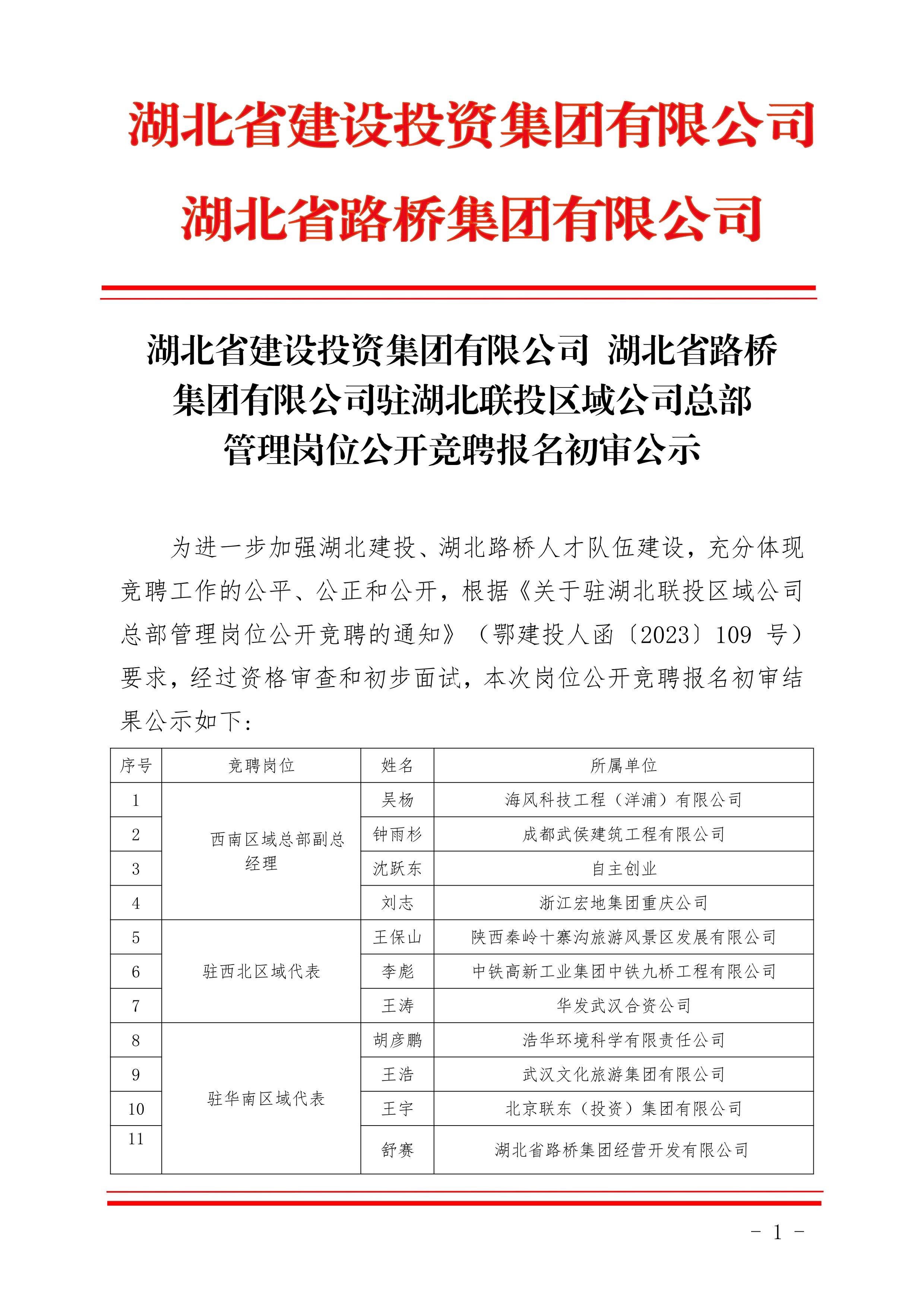 湖北省建设投资集团有限公司、华体会平台驻湖北联投区域公司总部管理岗位公开竞聘报名初审公示