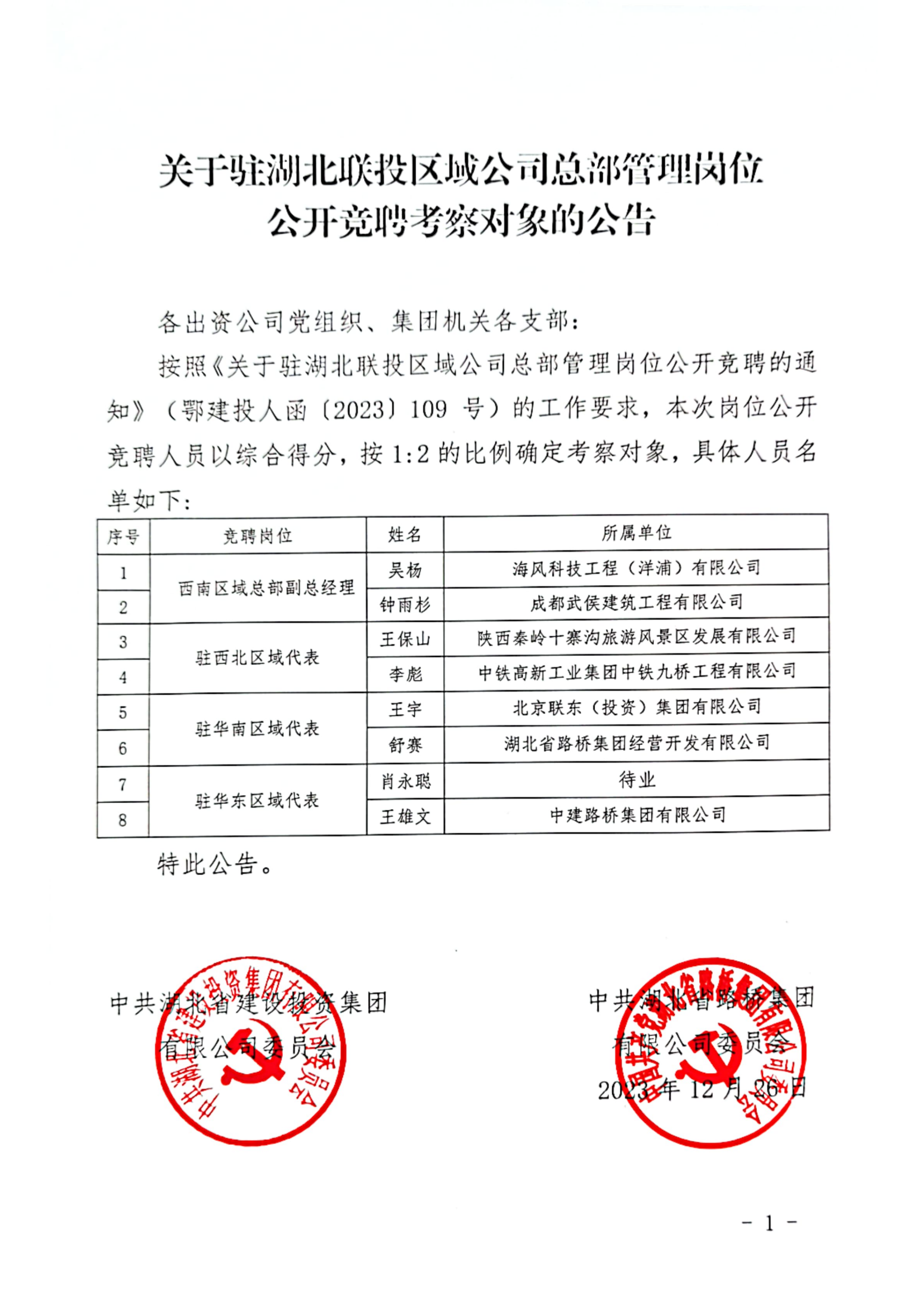 关于驻湖北联投区域公司总部管理岗位公开竞聘考察对象的公告