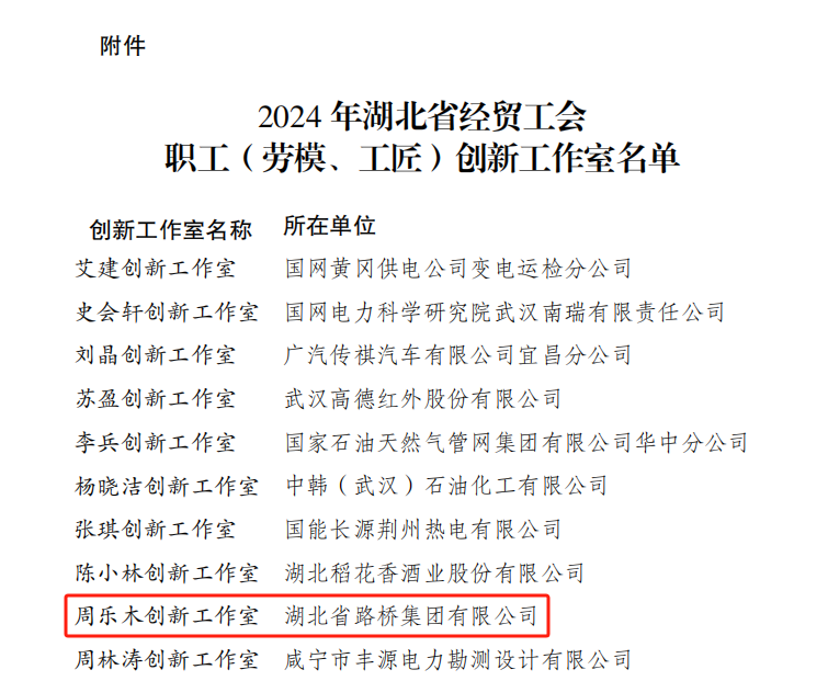 近日,湖北省经贸工会印发了《关于 2024年湖北省经贸工会职工(劳模、工匠)创新工作室建设结果的通报》,湖北路桥“周乐木创新工作室”获评“湖北省经贸工会职工创新工作室”。