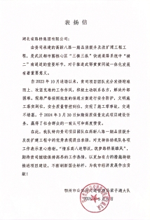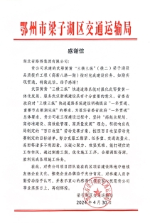 近日,湖北路桥高新八路一期品质提升及改扩建工程项目部收到鄂州市梁子湖区交通运输局、鄂州市公安局交通管理局梁子湖大队的感谢信及表扬信,对高新八路一期项目保质保量完成建设任务,如期实现全线贯通给予高度肯定。