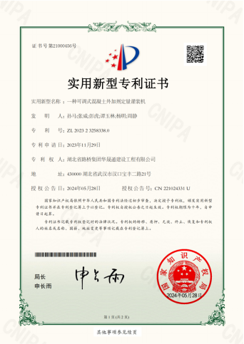 5月28日,由湖北路桥华晟通公司自主研发的新型实用专利《一种可调式混凝土外加剂定量灌装机》顺利通过国家知识产权局严格审查,获得专利证书。在特种混凝土领域,湖北路桥华晟通公司获得多个专利、软著、标准图集、科技项目、实体工程及标准等相关知识产权,牢固占据特种混凝土新赛道,进一步增强了公司科研创新驱动生产发展的强大动力。