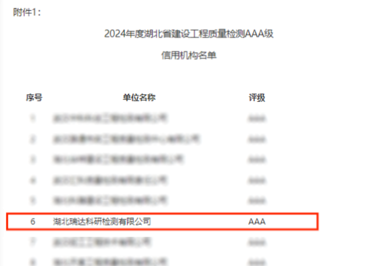 1月8日,湖北省建设工程质量安全协会发布了2024年度湖北省建设工程质量检测AAA级信用机构评价结果,联投湖北路桥瑞达科研检测公司凭借优异的诚信建设和信用管理能力,荣获最高级“AAA级”信用机构评价。