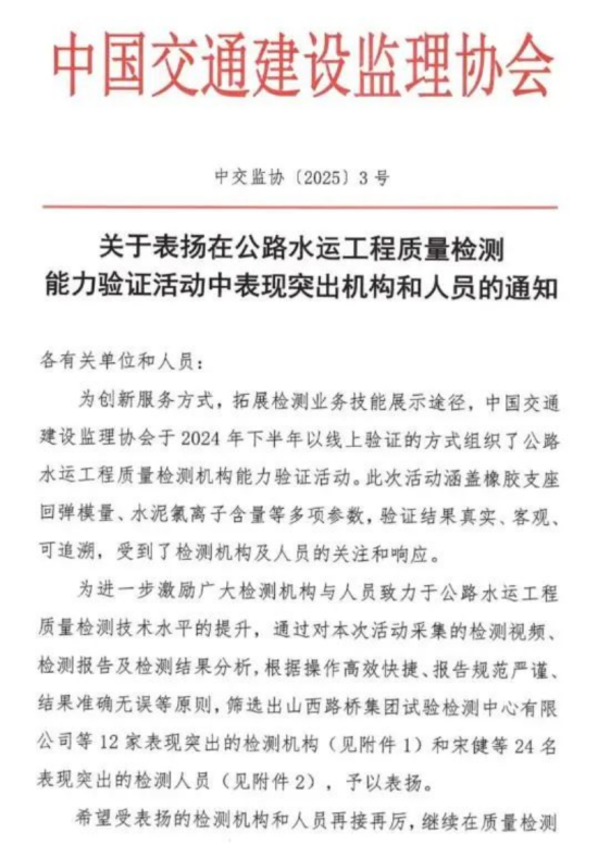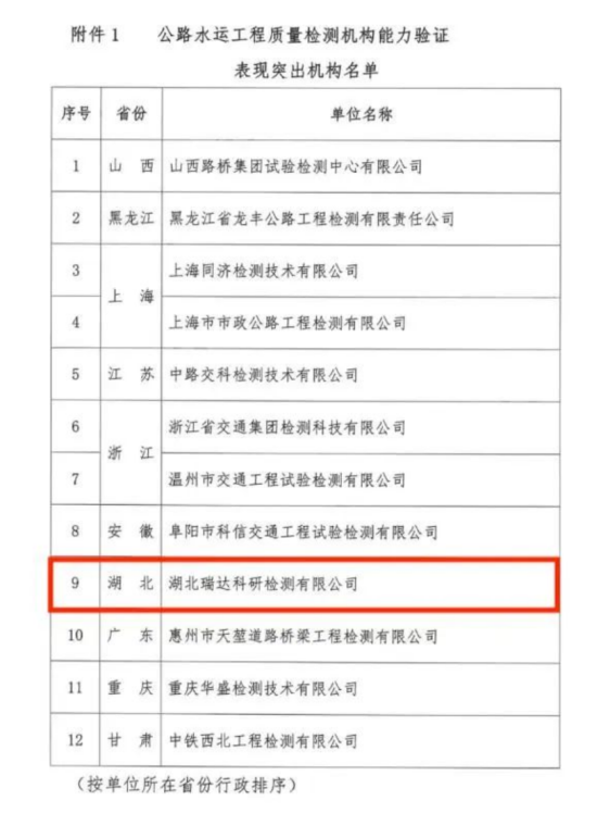 1月9日,中国交通建设监理协会发布表彰通知,联投湖北路桥瑞达科研检测公司成功蝉联第二届公路水运工程质量检测能力验证“表现突出机构”荣誉。成为全省唯一一家连续两届获此荣誉的检测机构。