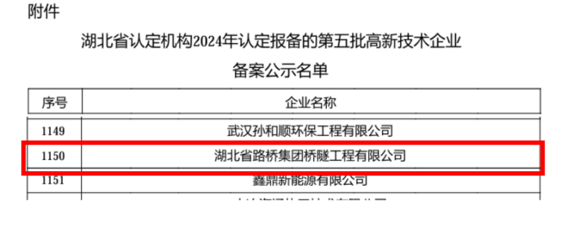 1月15日,全国高新技术企业认定管理工作领导小组办公室发布了湖北省2024年第五批国家高新技术企业的备案名单,联投湖北路桥桥隧公司通过认定,正式迈入国家高新技术企业行列。这标志着桥隧公司在科技创新发展道路上取得新的里程碑,开启企业发展的新篇章。