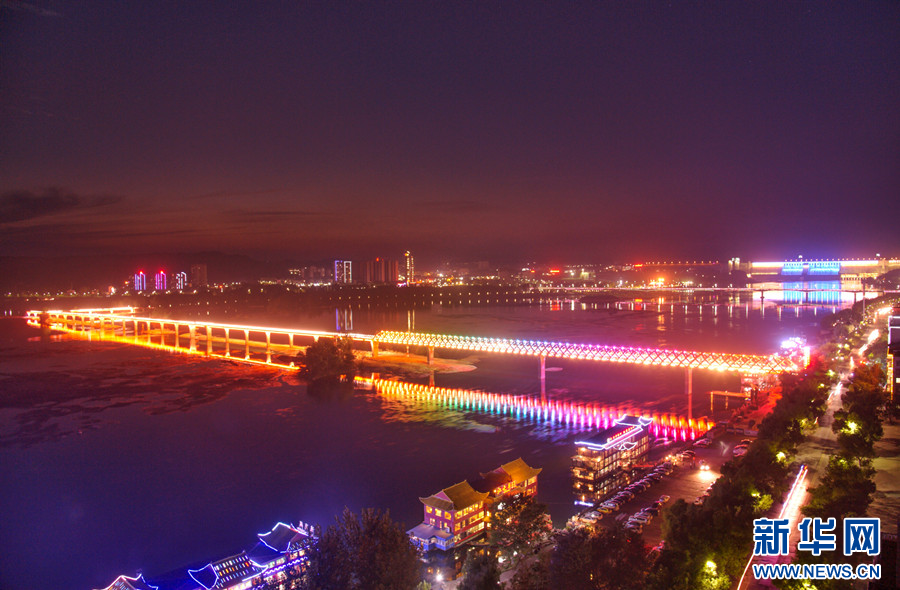 夜幕降临,丹江口水都二桥霓虹闪烁,高耸的三跨拱架宛如几道“彩虹”横卧江面。
