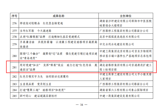 5月16日,中国施工企业管理协会公布了2024年“工程建设企业党建工作优秀成果”的名单,湖北路桥京港澳改扩建工程1标项目成功获评“工程建设企业党建工作优秀二等成果”。